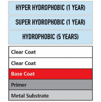 Purpose: To protect a vehicle from weather, UV rays, bird droppings, acid rain, road grime, light scuffs, scratches/abrasions, heat up to 1,800 centigrade, environmental stains, and elements, while repelling water, dirt, & other contaminates. Comprised of: