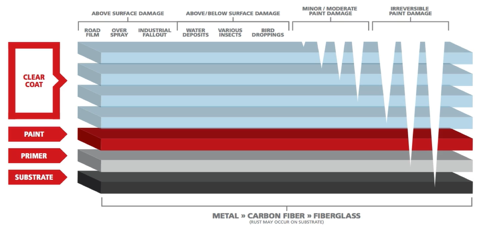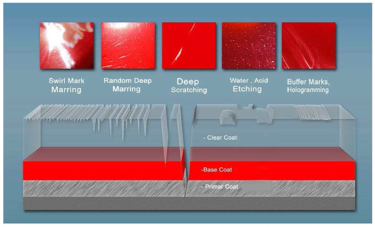 Below chart shows above surface damage, above / below surface damage, minor / moderate paint damage that can be paint corrected. Unfortunately irreversible paint damage that has gone through clear coat, possible paint / primer or even substrate cannot be paint corrected and the vehicle needs to be painted or possibly have body work done.